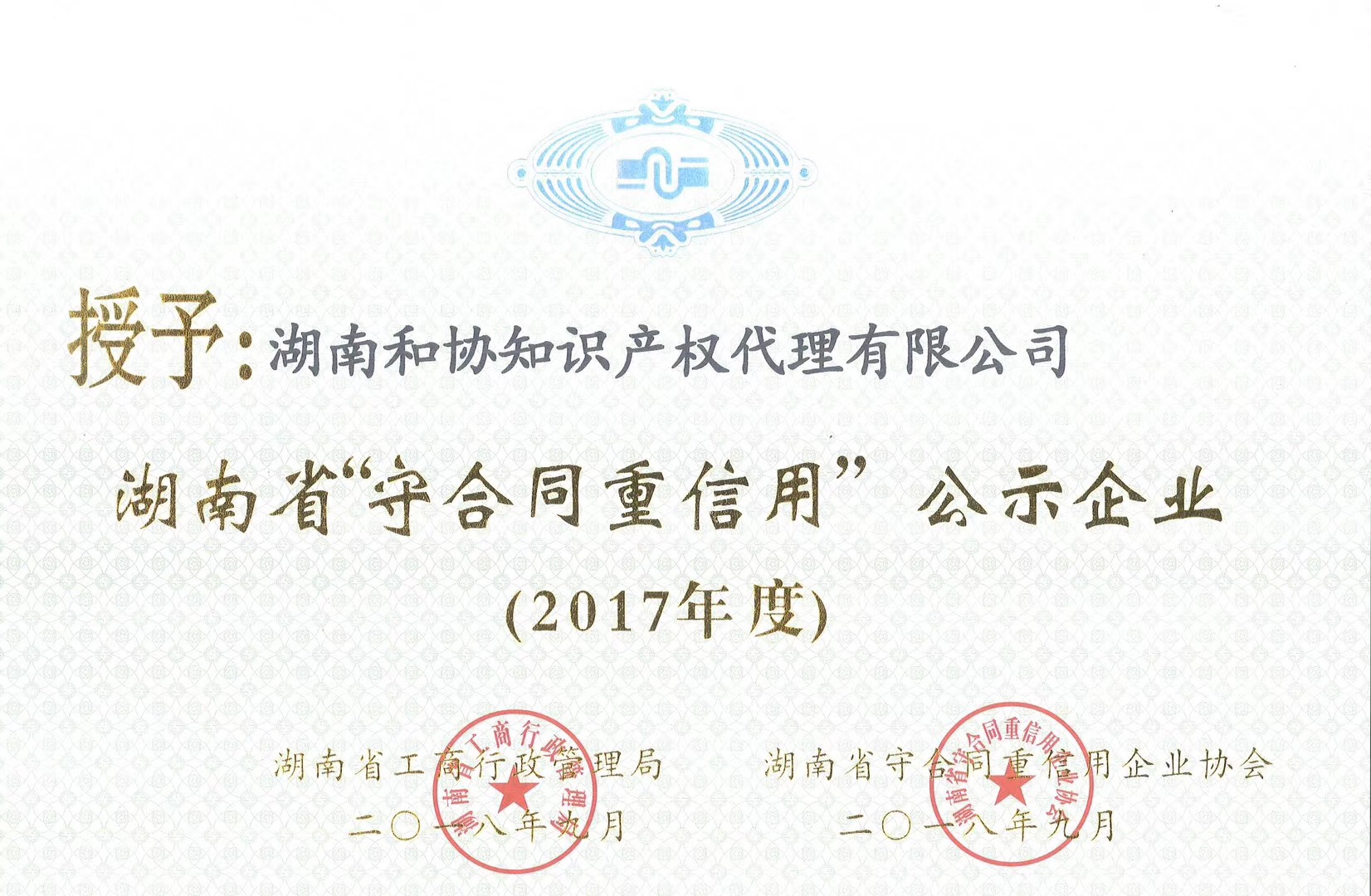 近日,湖南和协知识产权代理有限公司荣获“2017年度湖南省守合同重信用企业”及“2017年度长沙市守合同重信用企业”称号。